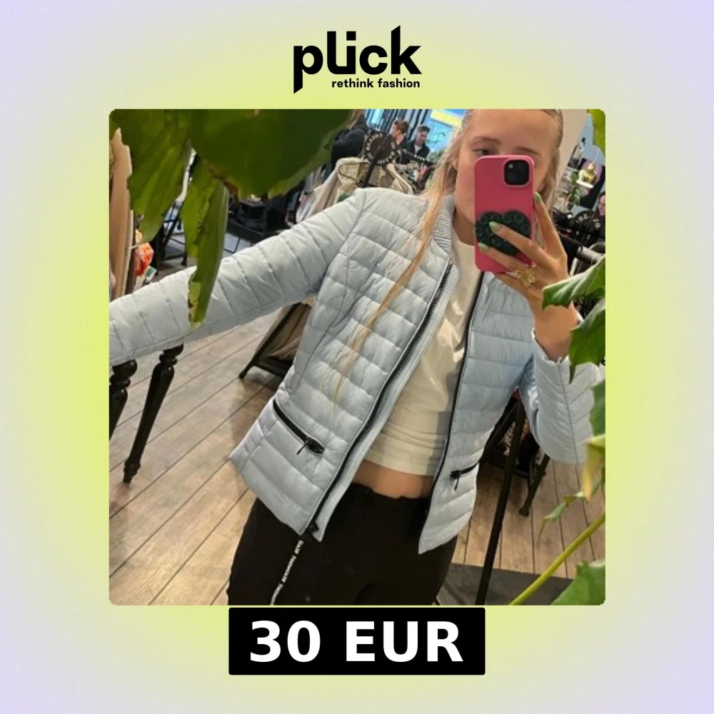 Säljer en ljusblå jacka med quiltad design och svarta dragkedjor på fickorna. Jackan har lång ärm, rundad krage och stängs med dragkedja framtill.