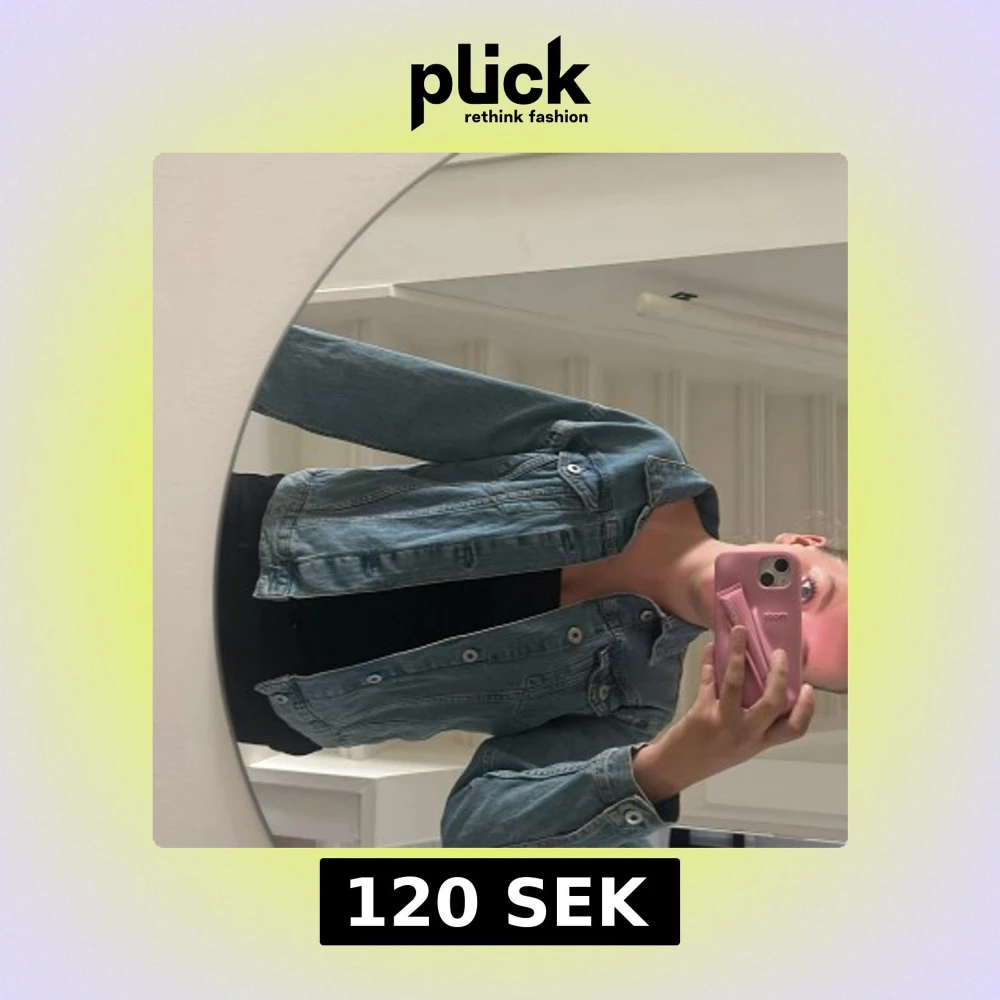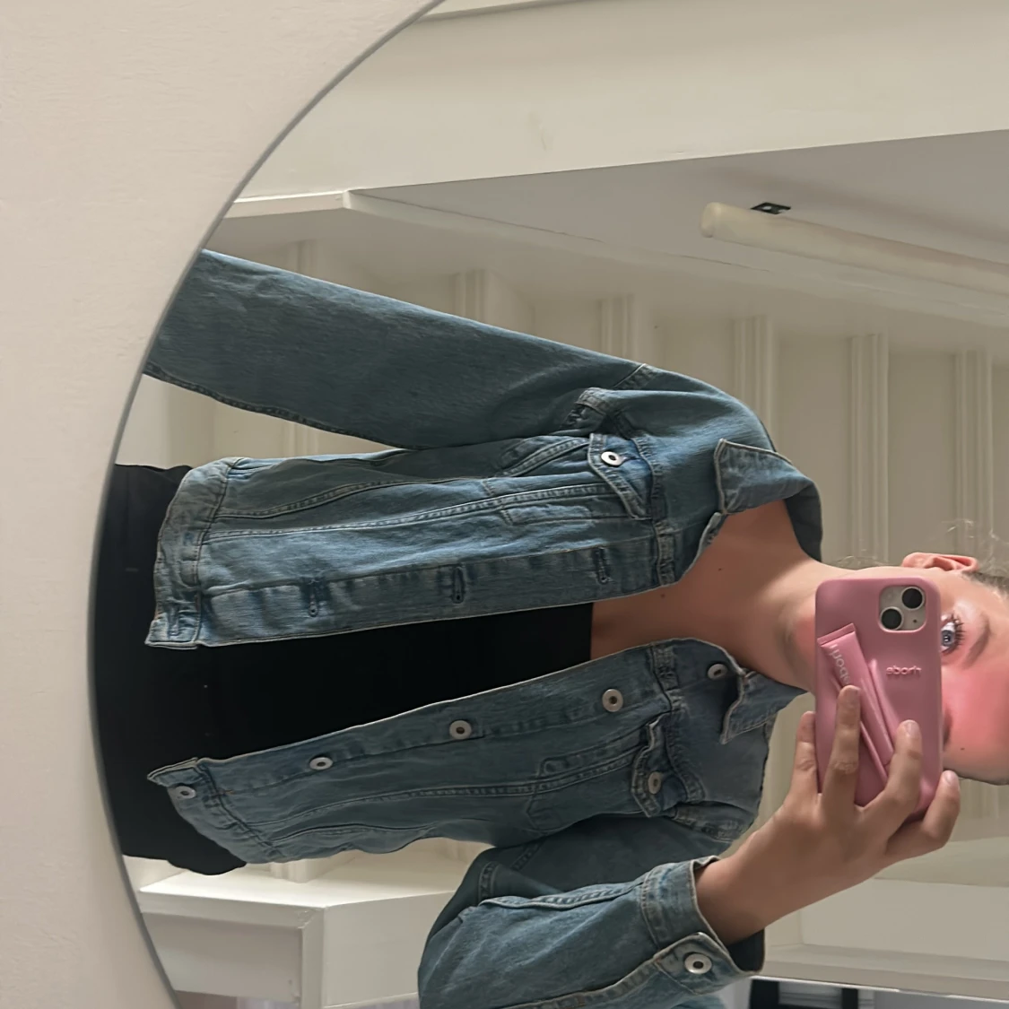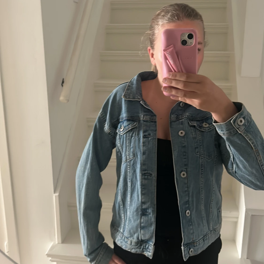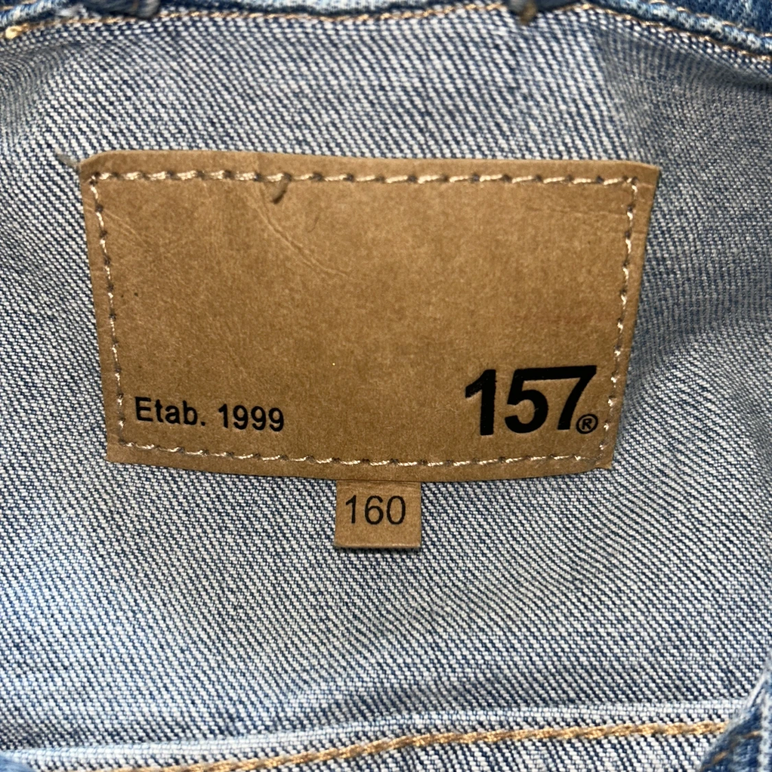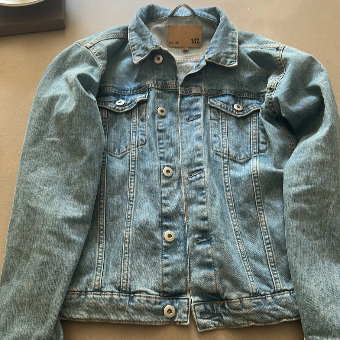 Säljer en klassisk ljusblå jeansjacka från 157 med silverfärgade knappar framtill och två bröstfickor med lock. Jackan har en rak passform och är långärmad. Den är i storlek 160 men passar även mig som har 170 och xs