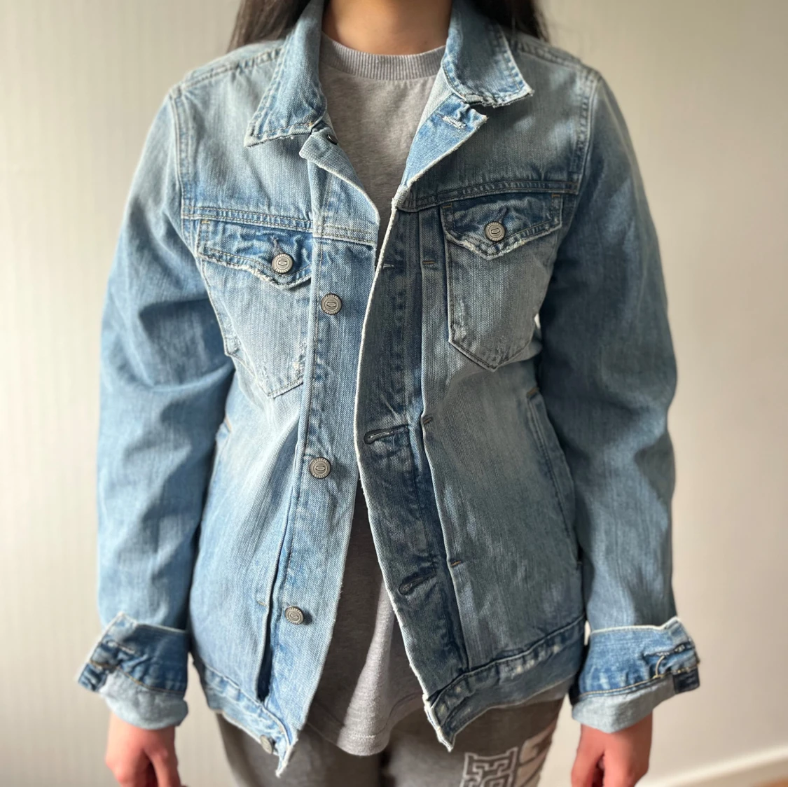 Snygg ljusblå jeansjacka med klassisk krage och silverfärgade knappar framtill. Jackan har två bröstfickor med lock och knapp, samt raka ärmar. Perfekt för dig som gillar en avslappnad och tidlös stil.