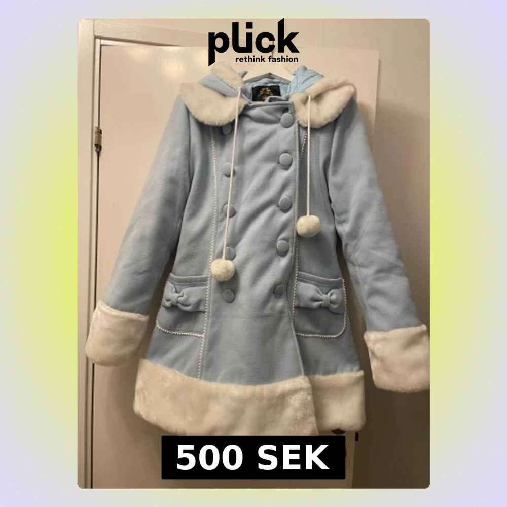 Superfin ljusblå pälsjacka från Hell Bunny med fluffig vit fuskpäls på krage, ärmslut och nederkant. Jackan har huva, snörning i ryggen, stora knappar framtill, rosetter på fickorna och söta pompoms. Quiltad insida för extra värme och mysig vinterstil.