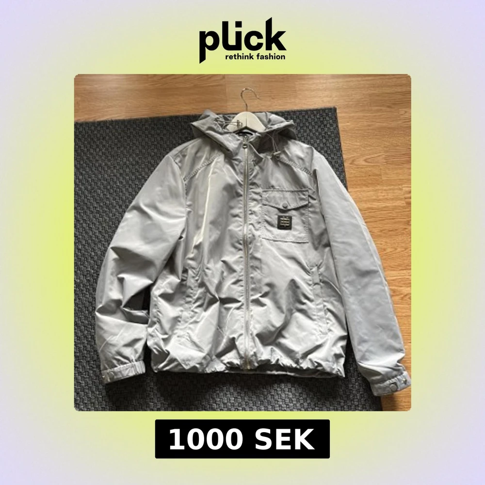 Snygg ljusgrå vindjacka från Bvaldi med huva och dragkedja framtill. Jackan har en bröstficka med lock och metallogo, samt två sidofickor. Justerbara muddar med tryckknappar och elastisk nederkant. Perfekt för blåsiga och regniga dagar. Köpt från bvaldis hemsida för ett tag sen men har inte kommit så mycket till användning så den är i princip ny.