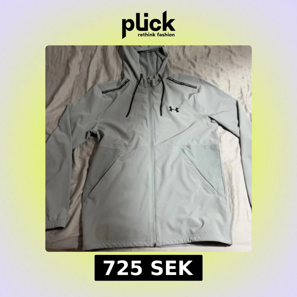 Snygg ljusgrå vindjacka från Under Armour med huva, svarta snören och dragkedja framtill. Jackan har två stora fickor, perforerade detaljer på sidorna och logga på bröstet. Perfekt för dig som gillar sportig och clean stil.