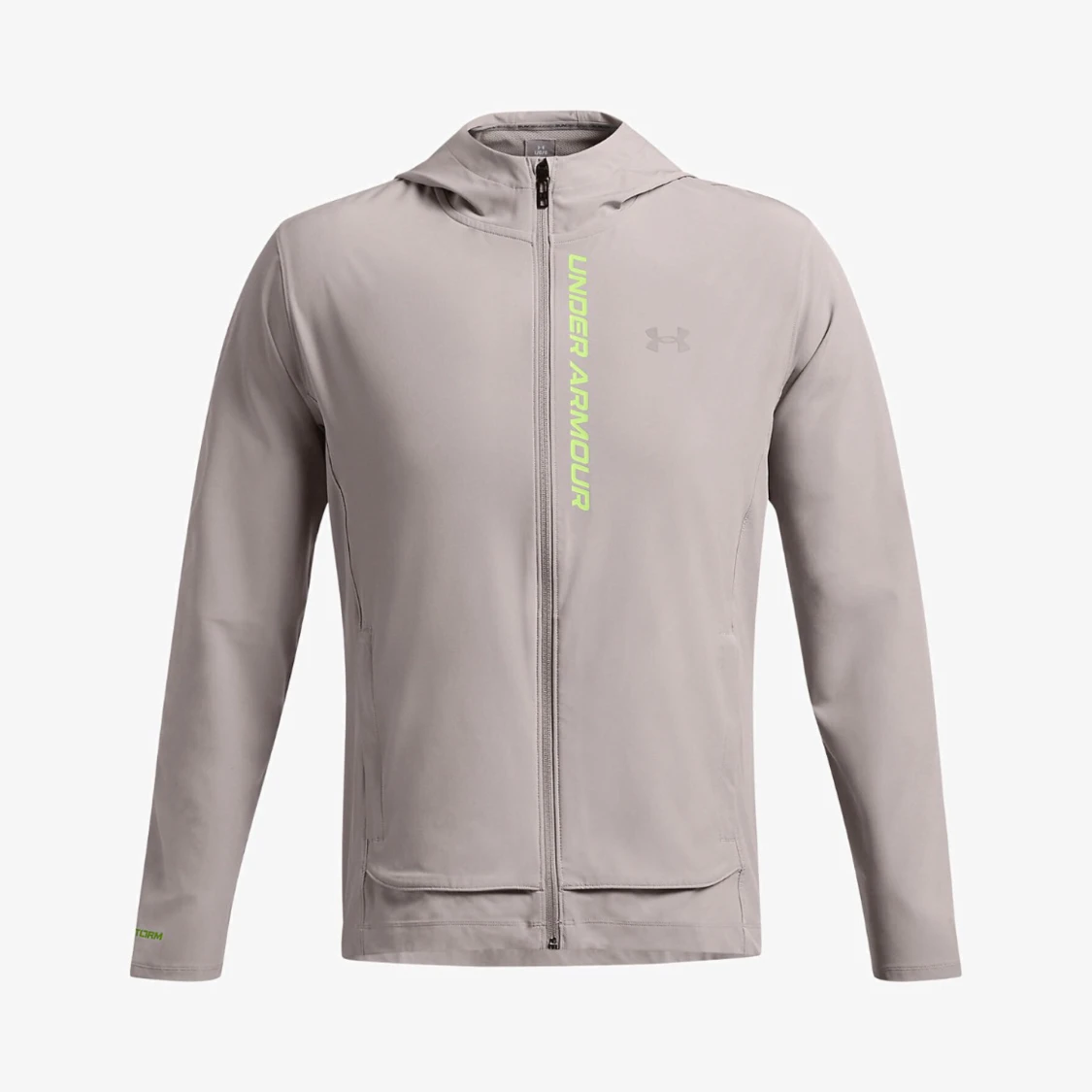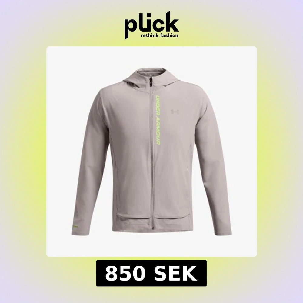 Säljer en stilren ljusgrå vindjacka från Under Armour med huva och hel dragkedja. Jackan har en clean look med logga och text i neongrönt framtill. Perfekt för vardag men även för träning. Storleken är S och skicket är utmärkt.