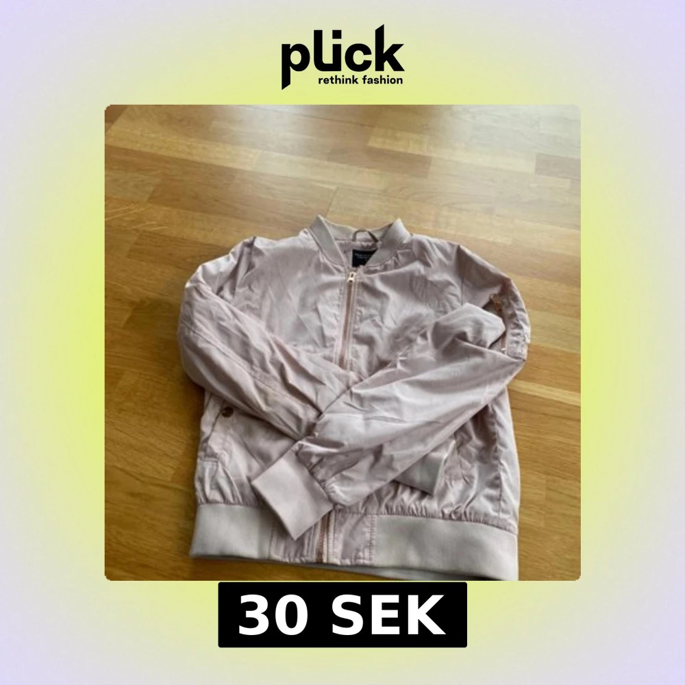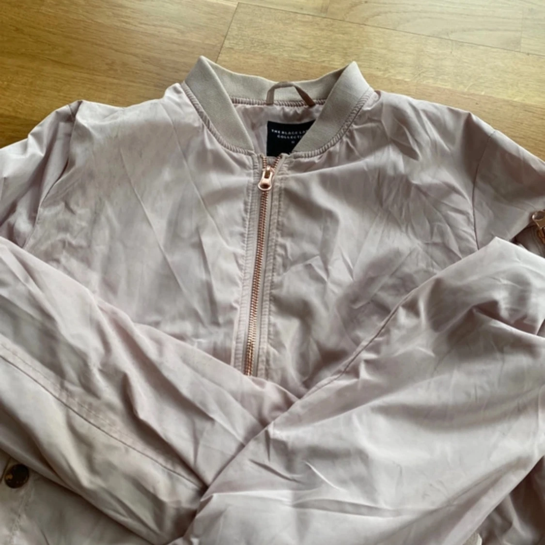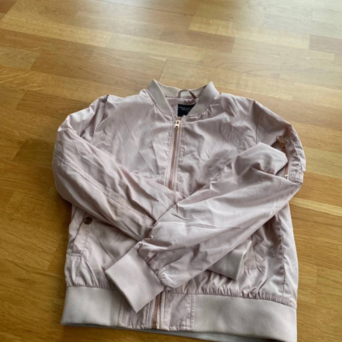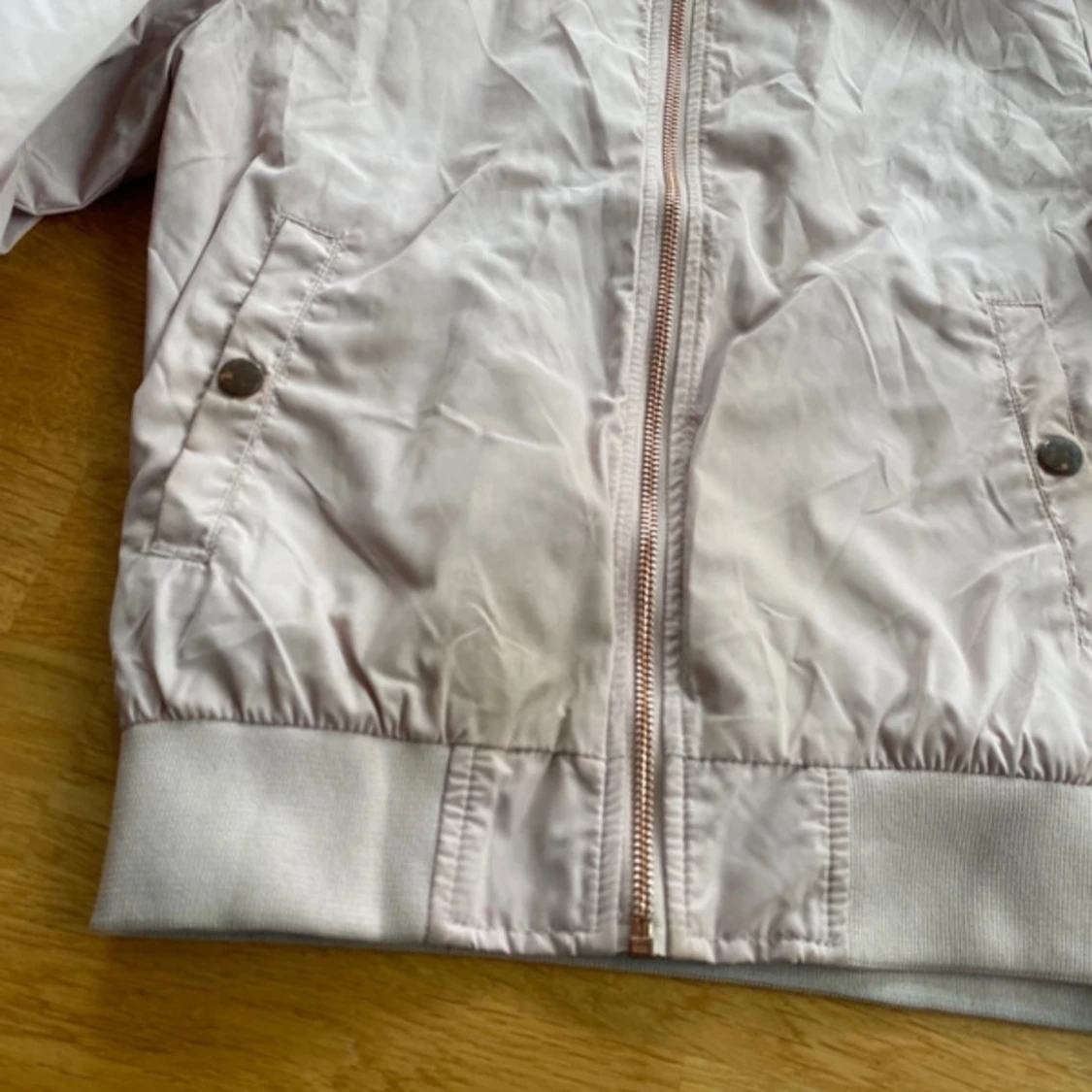 Ljusrosa bomberjacka med dragkedja framtill, ribbade muddar och fickor med tryckknappar. Jackan har en bomberkrage. Jackan har en fläck framtill som ni kan se på tredje bilden.