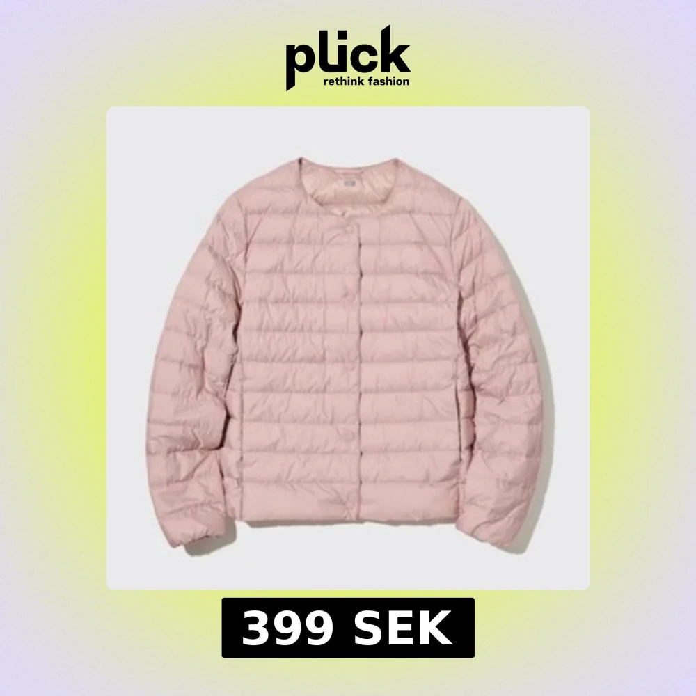 Säljer en ljusrosa, tunn och lätt dunjacka med rund halsringning och diskreta knappar framtill. Jackan har quiltad design och lång ärm, perfekt för lager-på-lager. Enkel och clean look som passar till det mesta.