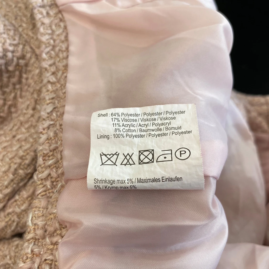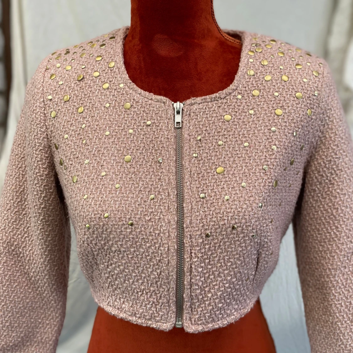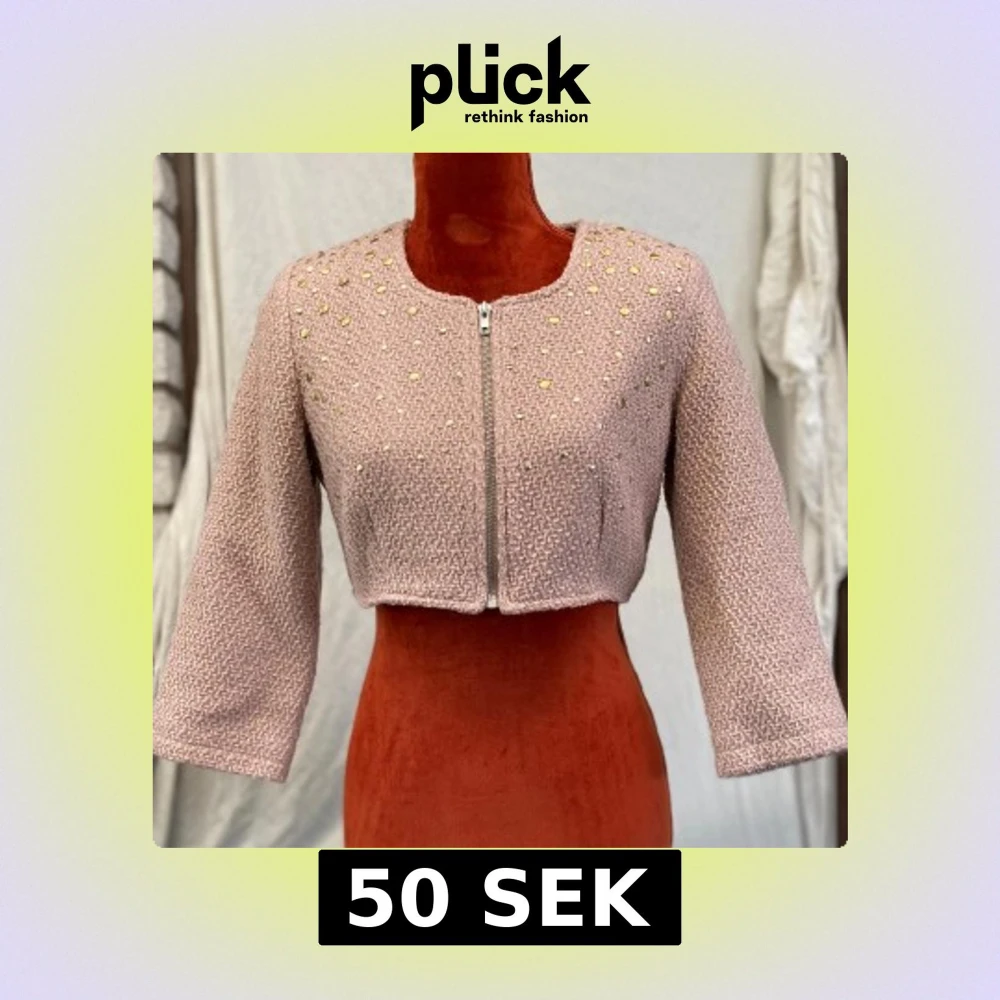 Superfin ljusrosa croppad cardigan jacka med trekvartsärm och dragkedja framtill. Jackan har ett stickat utseende och är dekorerad med små guld- och silverfärgade nitar upptill. Fodrad med mjukt tyg på insidan för extra komfort. 64% polyester 17% viskos 11% akryl 8 % bomull Foder: 100% polyester Längd: 37 cm Bystvidd: 46 cm. Inga bilder när den sitter på mig! Katter finns i hemmet!