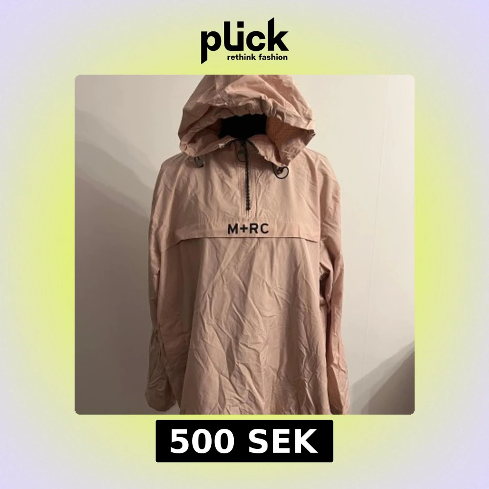 Säljer en ljusrosa vindjacka från M+RC NOIR med huva och halv dragkedja framtill. Jackan har en avslappnad passform och är tillverkad i ett lätt syntetmaterial. Perfekt för blåsiga dagar och enkel att slänga på sig över en hoodie.