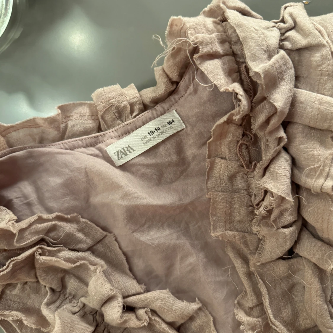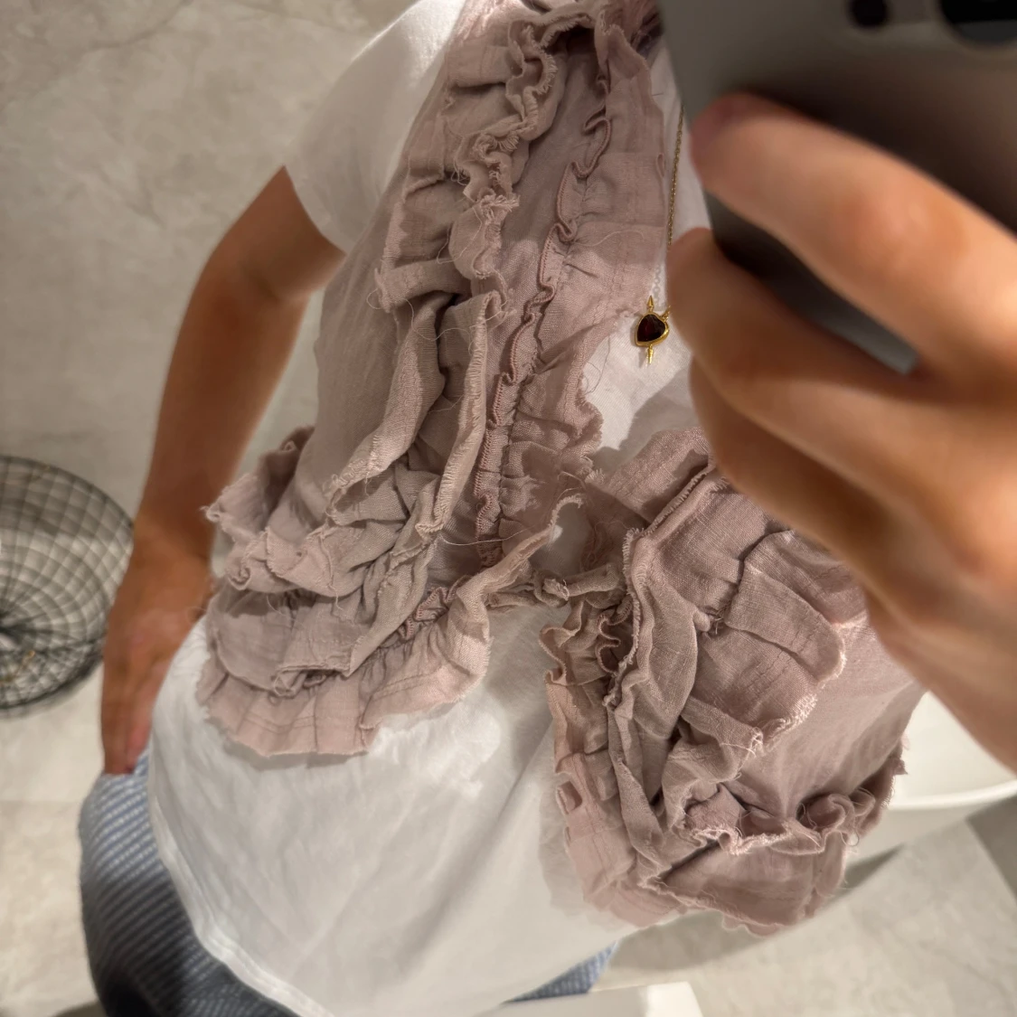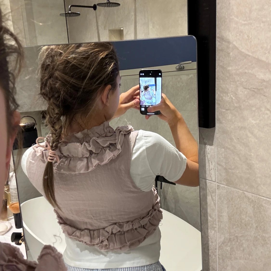Säljer en söt ljusrosa bolero med volangdetaljer. Perfekt för att ge en romantisk touch till din outfit. Västen är ärmlös och har en luftig passform.