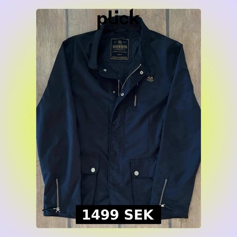 Riktig snygg och stilren marinblå jacka från Morris med klassisk krage, två stora fickor framtill med tryckknappar, och dragkedjor vid ärmsluten. Jackan har en liten patch med märket på bröstet. Perfekt till våren och kyligare sommardagar. Två innerfickor. Extra knappar finns kvar.