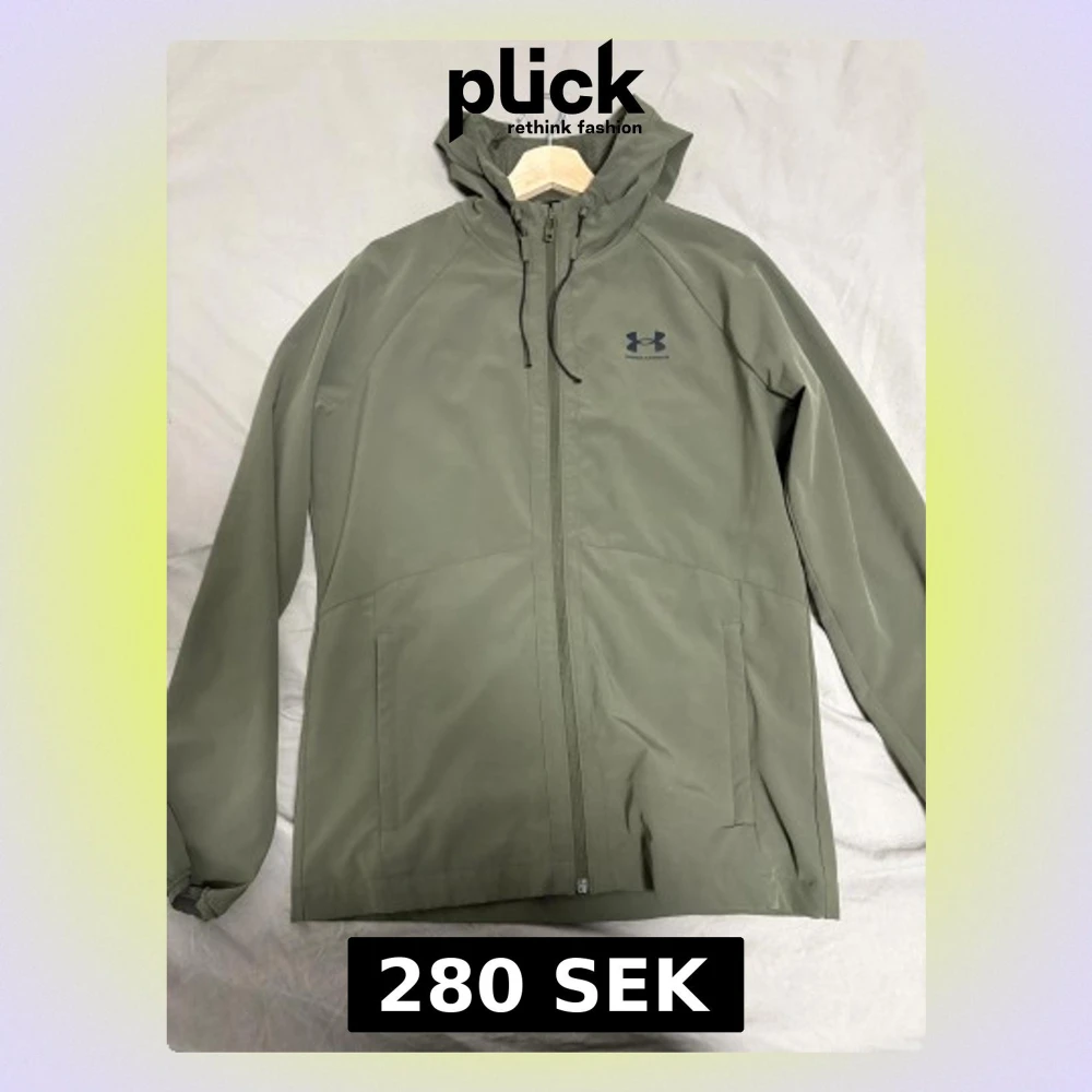 Snygg olivgrön vindjacka från Under Armour med huva och dragkedja framtill. Jackan har två stora fickor, meshfoder på insidan och justerbar dragsko vid huvan. Perfekt för blåsiga dagar och sportiga outfits.