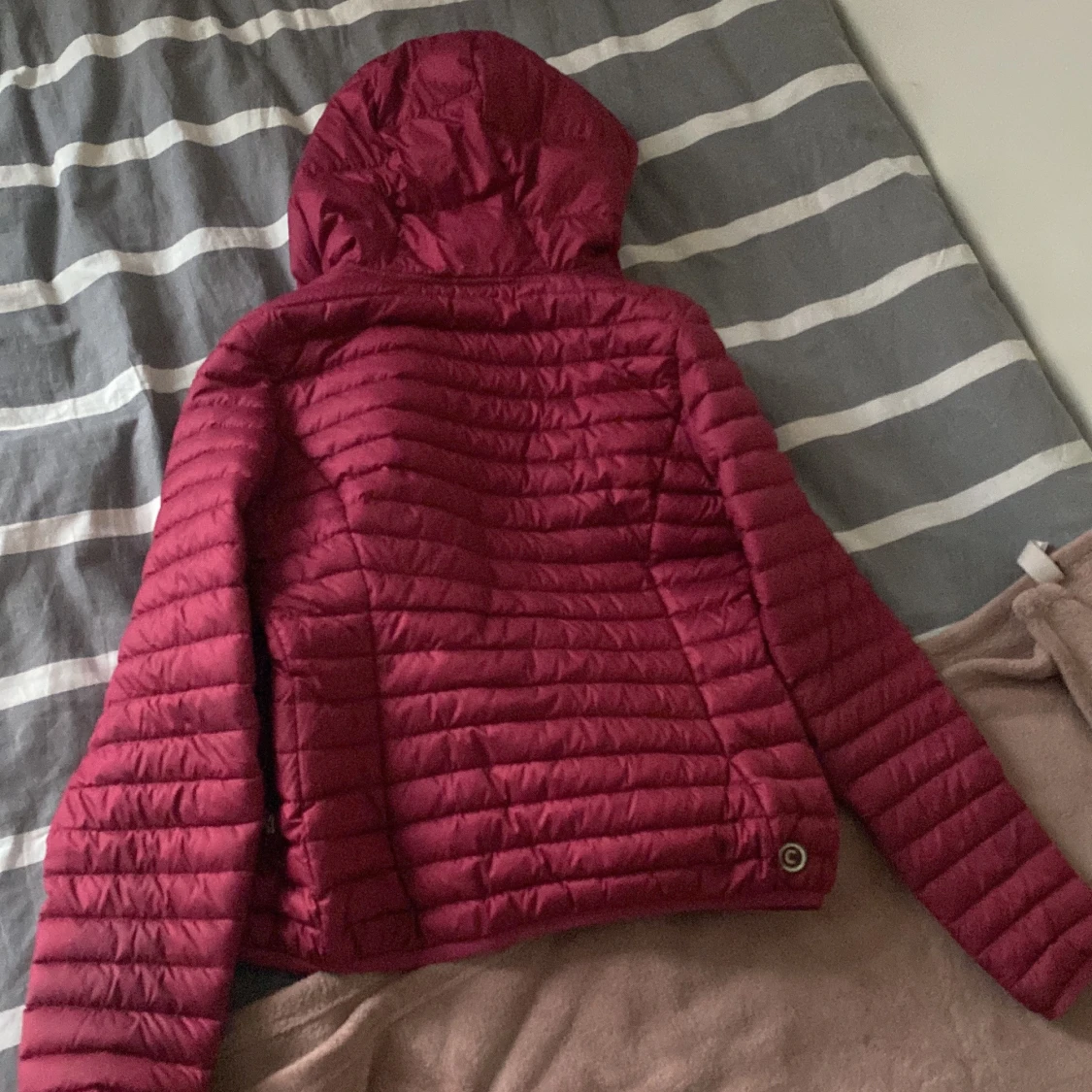Snygg vinröd dunjacka från Colmar med huva och dragkedja. Jackan har en quiltad design och två praktiska fickor med dragkedjor. Perfekt för kyligare dagar och ger en stilren look.