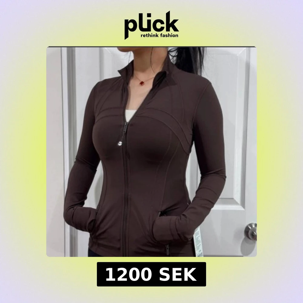 Slimmad brun zipjacka från Lululemon med hög krage och långa ärmar. Jackan har praktiska fickor med dragkedja och snygga sömdetaljer som framhäver siluetten. Perfekt för dig som gillar en sportig och clean look.