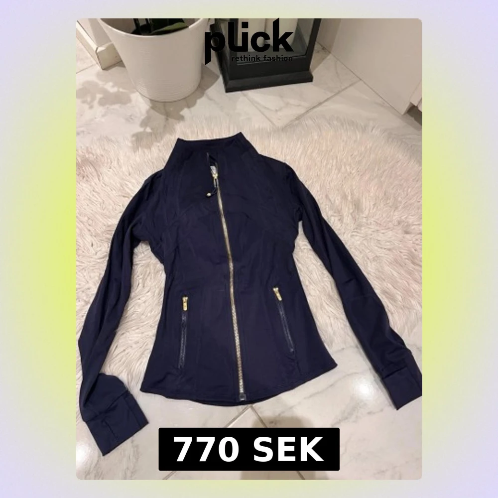 Snygg marinblå jacka från Lululemon med figurnära passform och guldfärgade dragkedjor. Jackan har hög krage, långa ärmar och två fickor framtill. Tillverkad i ett stretchigt funktionsmaterial som passar perfekt till vardags eller träning.