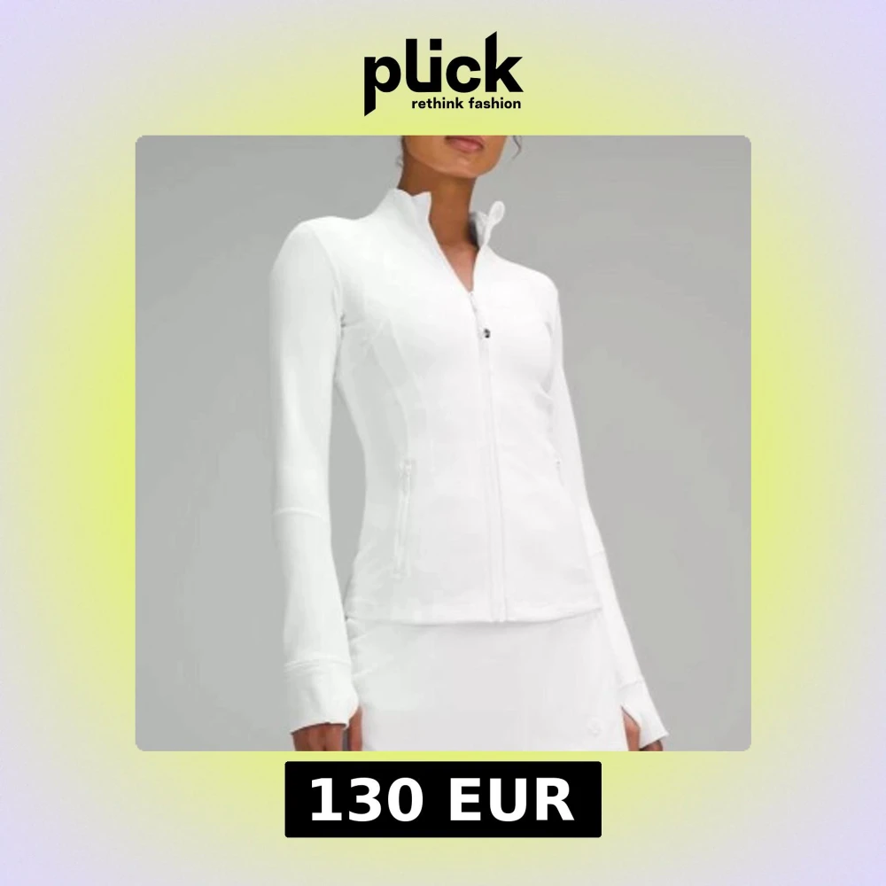 Säljer en vit, figursydd träningsjacka från Lululemon med dragkedja framtill och höga fickor med dragkedja. Jackan har lång ärm och stårkrage, tillverkad i ett stretchigt material som andas. storlek 2
