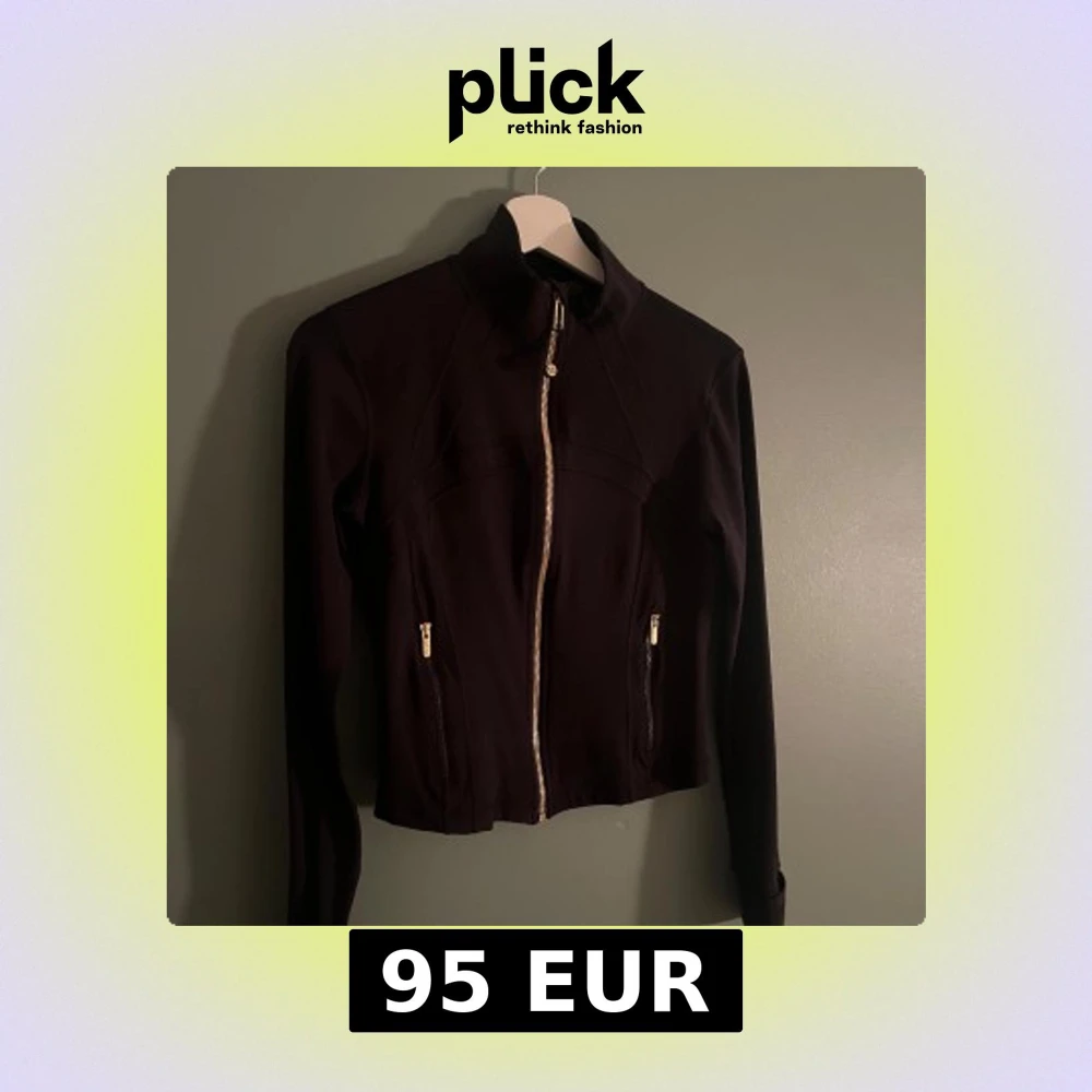 Svart, figursydd cropped träningsjacka från Lululemon med guldig dragkedja framtill och på fickorna. Jackan har hög krage, långa ärmar och är tillverkad i ett stretchigt material av polyester och elastan. Perfekt för dig som gillar sportig och clean stil.