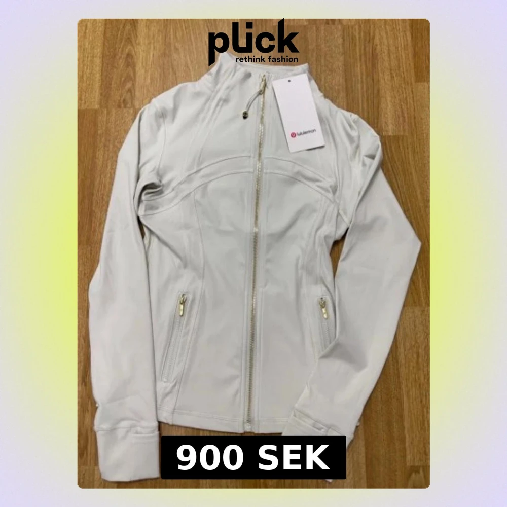 Snygg vit jacka från Lululemon med figurnära passform och guldfärgade dragkedjor. Jackan har hög krage, långa ärmar och två fickor med dragkedja. Perfekt för dig som gillar sportig stil och vill ha något bekvämt och stilrent.