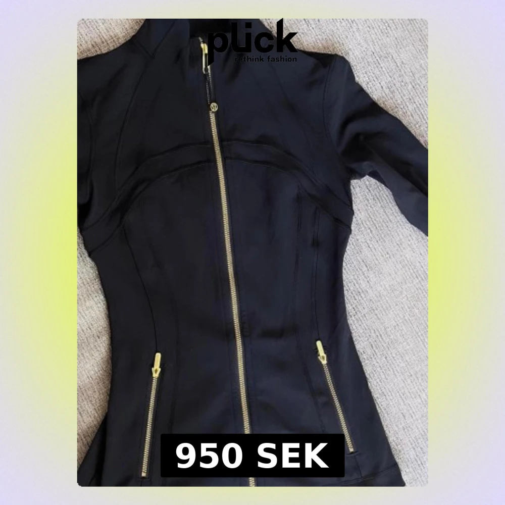 Slimmad svart träningsjacka från Lululemon med guldfärgade dragkedjor framtill och på fickorna. Jackan har lång ärm, hög krage och är tillverkad i ett stretchigt syntetmaterial som passar perfekt till aktiva dagar. Storlek 4