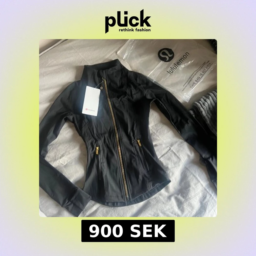 Slimmad svart träningsjacka från Lululemon med guldiga dragkedjor och hög krage. Jackan har två fickor med dragkedja och är tillverkad i ett stretchigt, mjukt syntetmaterial. Perfekt passform och snygga detaljer som ger en sportig vibe.
