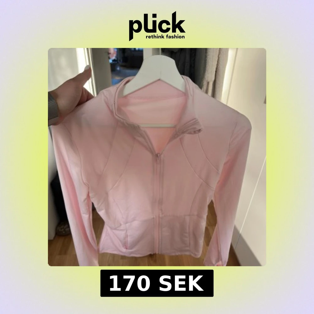 Säljer en ljusrosa träningsjacka med dragkedja framtill och hög krage. Jackan har långa ärmar och figurnära passform, perfekt för gymmet eller löprundan. Stl S
