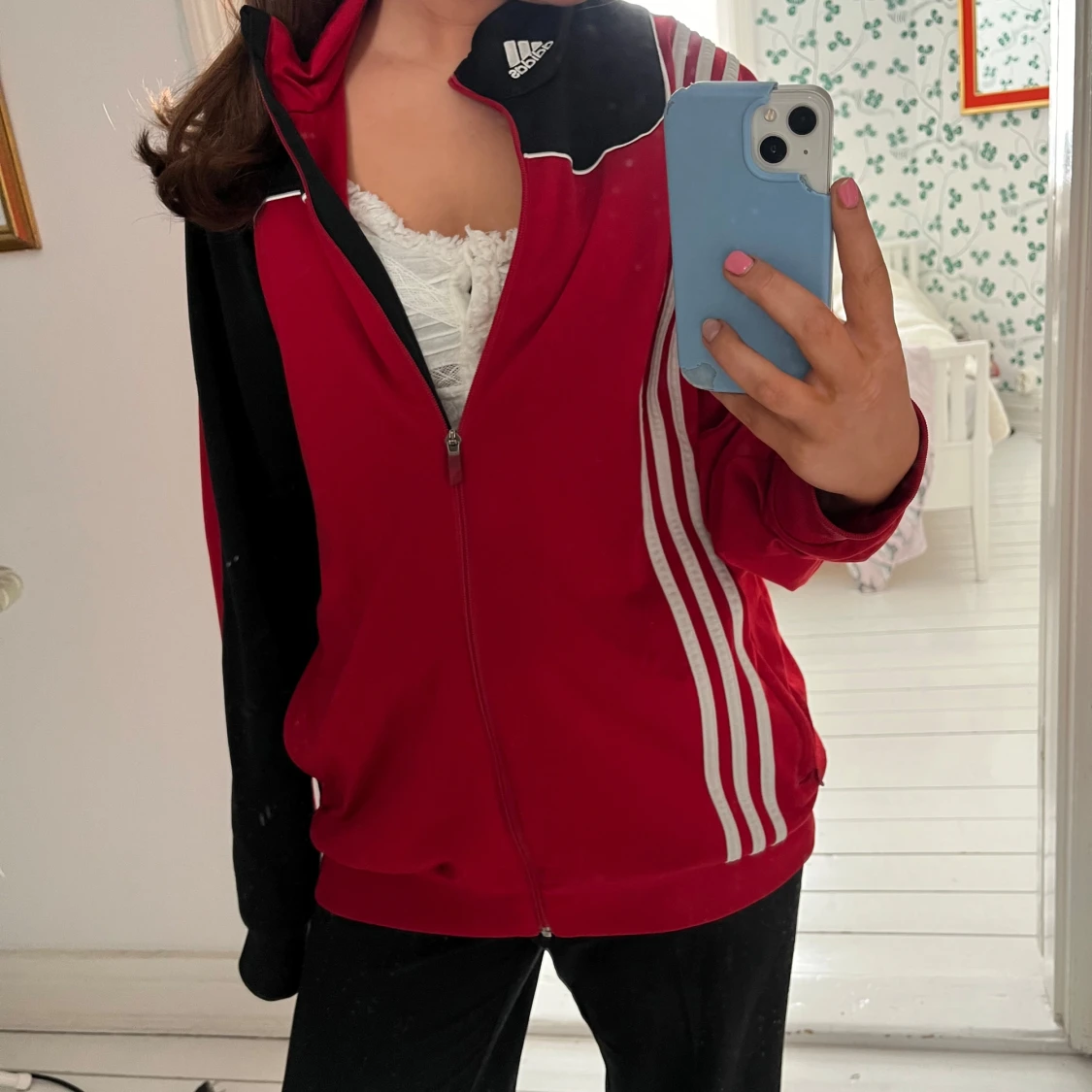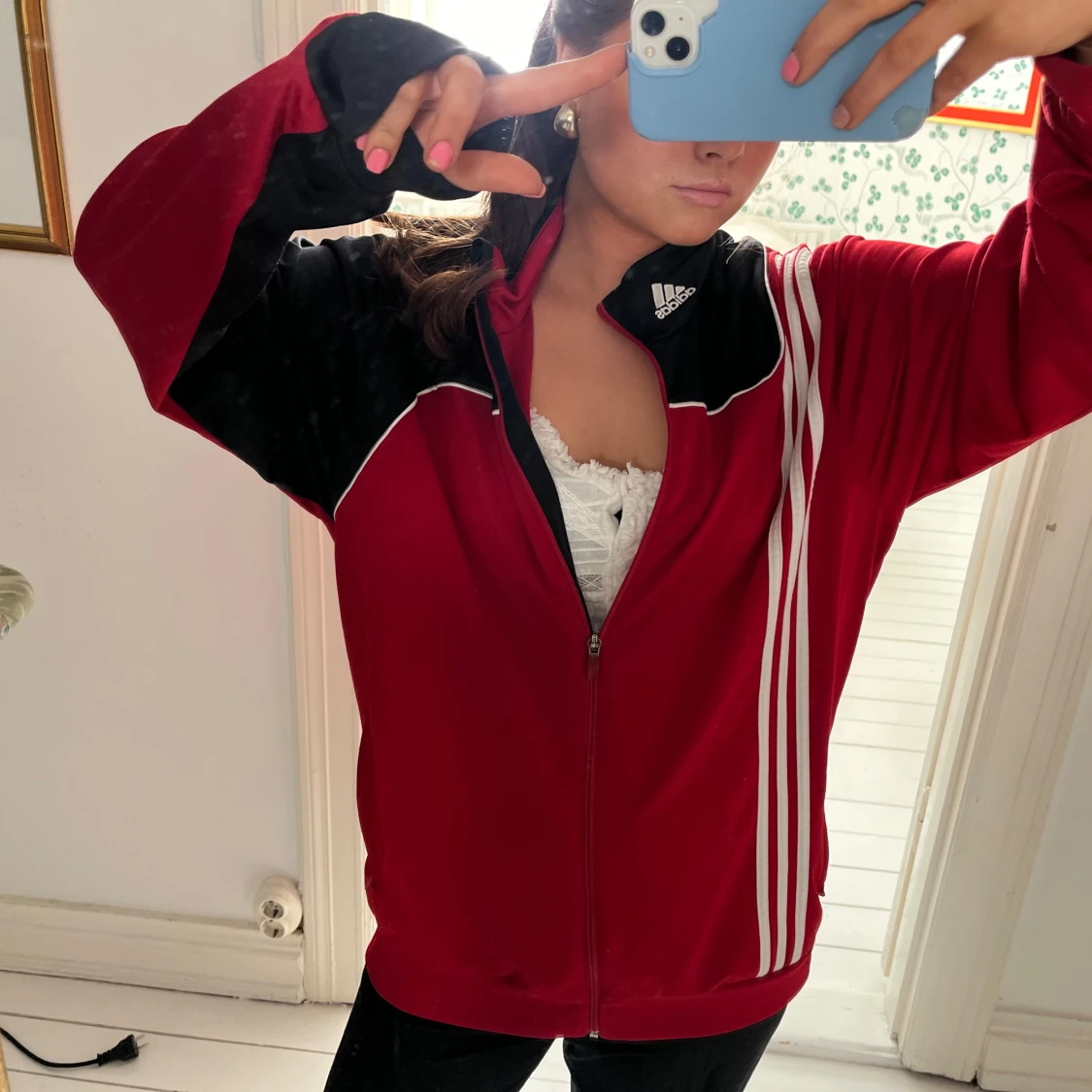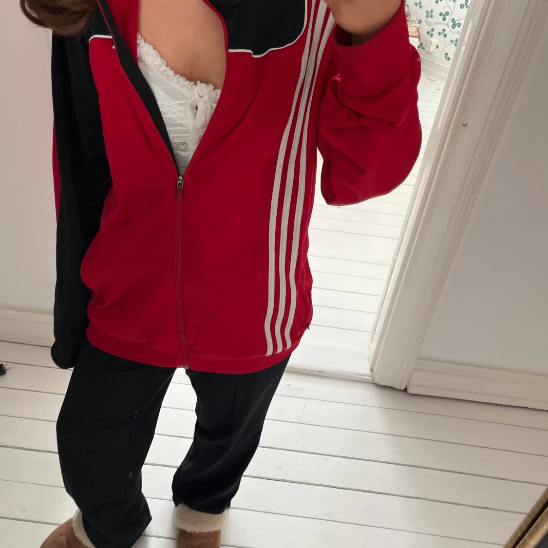 Säljer en röd och svart träningsjacka från Adidas med dragkedja och vita ränder på sidorna. Jackan har en sportig look och är perfekt för träning eller en avslappnad stil. Den har långa ärmar och en bekväm passform.
