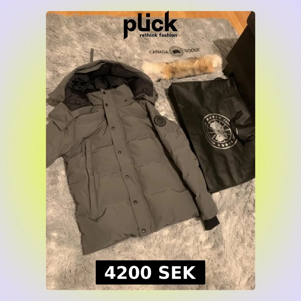 Säljer en grå dunjacka från Canada Goose med avtagbar pälskant till huvan. Jackan har quiltad design, svarta detaljer och logotyp på ärmen. Perfekt för kalla vinterdagar och riktigt snygg passform. Fodrad med dun och har praktiska fickor samt dragkedja och knappar framtill. Vid snabb affär 3700