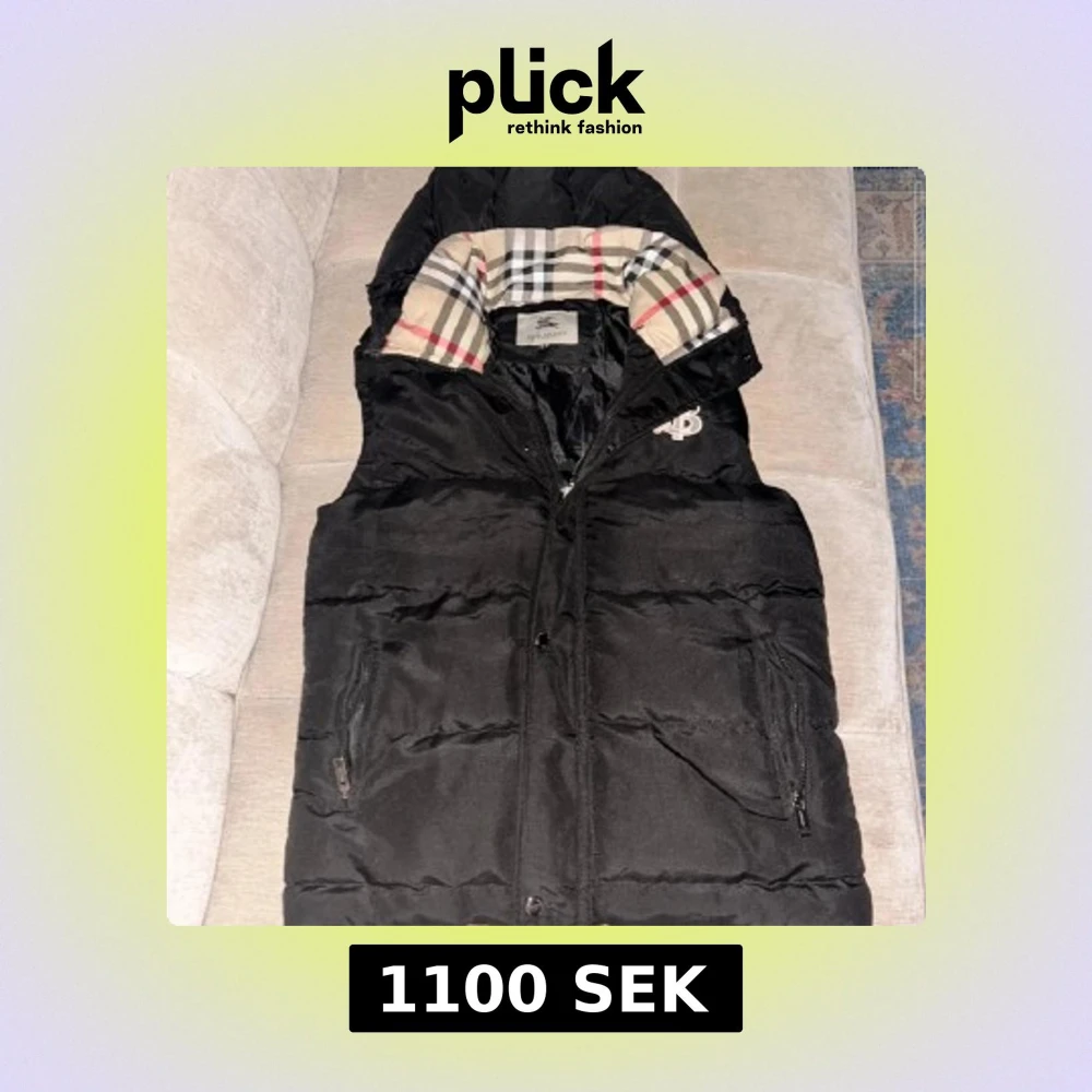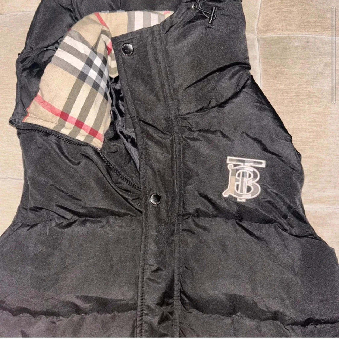 Svart dunväst från Burberry med klassiskt rutigt foder i huvan och broderad TB-logga på bröstet. Västen har dragkedja, knappar och två fickor med dragkedja. Perfekt för lager-på-lager och snygg streetstil. Pris kan diskuteras och byten går, skriv om ni har frågor