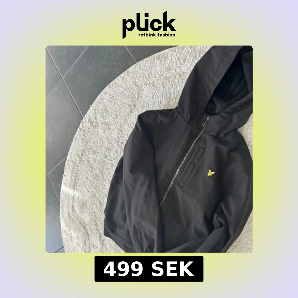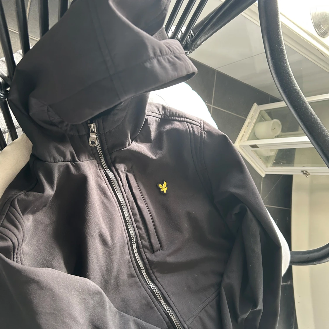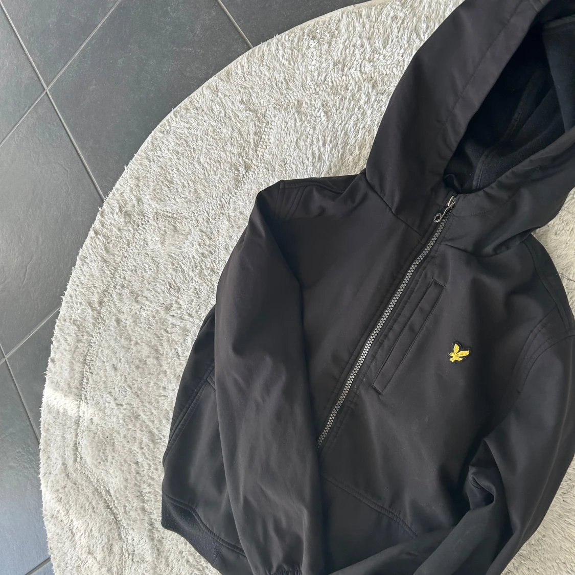 Säljer en stilren svart jacka med huva från Lyle & Scott. Jackan har en dragkedja framtill och ett litet gult broderat emblem på bröstet. Perfekt för svala dagar.