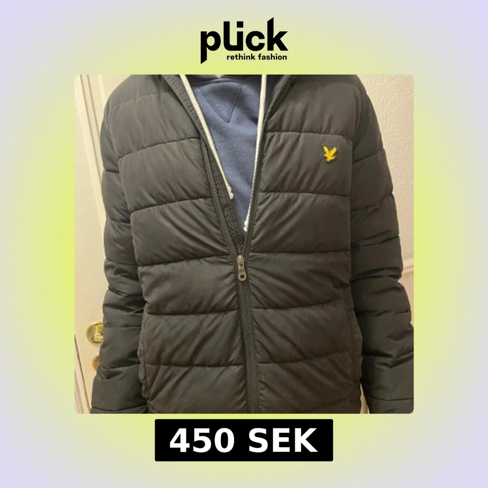 Svart pufferjacka från Lyle & Scott med gul logga på bröstet. Jackan har huva, horisontella quiltade sektioner och dragkedja framtill. Perfekt för kalla dagar och har en clean, modern look som funkar till streetwear.