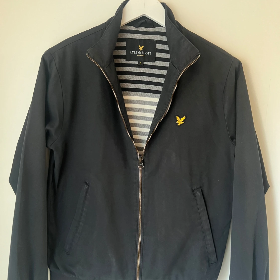 Lyle & Scott Vintage Jacka för sommaren och för dem som är runt 13 år. 44 cm bred i axeln och 68 cm lång från nacken till botten. Innanför jackan är det ett randigt mönster som man ser på bilderna, samt att det finns en ficka.
