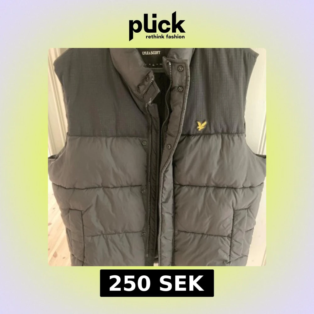 Säljer en svart dunväst från Lyle & Scott med klassisk gul logga på bröstet. Västen har hög krage, dragkedja och tryckknappar framtill samt två stora fickor. Perfekt för lager-på-lager och riktigt skön att bära under kyliga dagar.