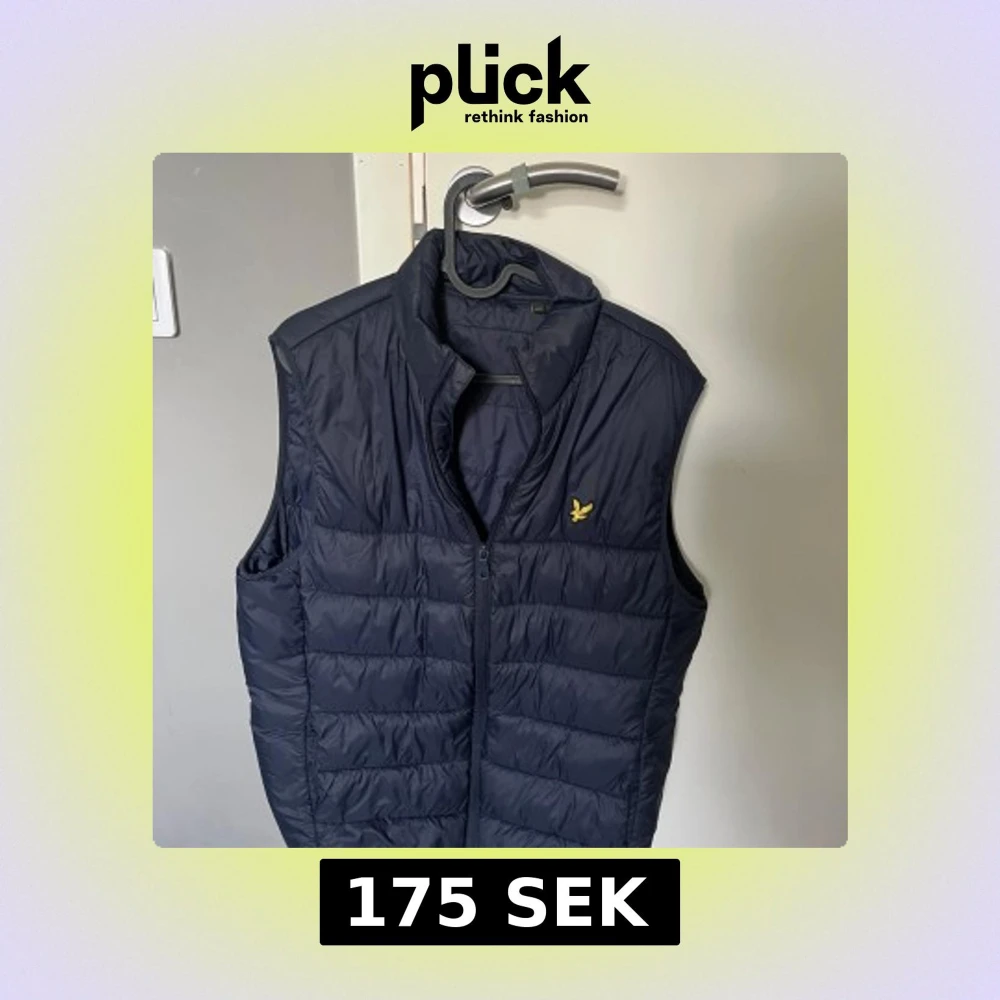 Snygg mörkblå dunväst från Lyle & Scott med gul broderad logga på bröstet. Västen har hög krage, quiltad design och dragkedja framtill. Perfekt att slänga över en hoodie eller tröja för extra värme.