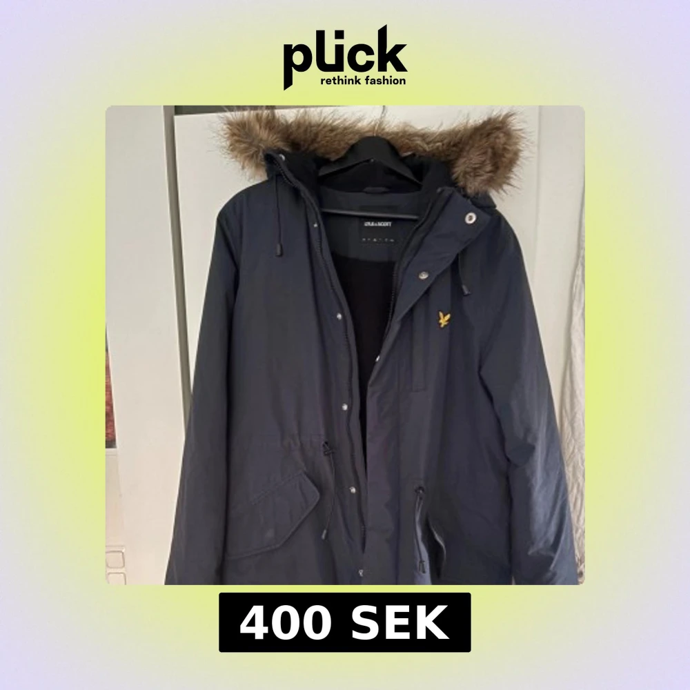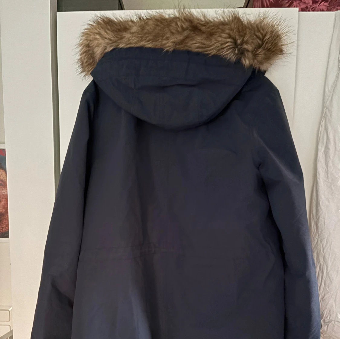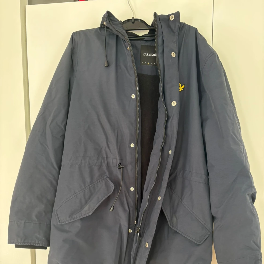 Parkas från Lyle & Scott i mörkblå färg med huva och gul logga på bröstet. Jackan har dragkedja, knappar och snörning i midjan samt stora fickor framtill. I bra skick, perfekt för kyliga dagar. Har kemtvättats för inte så länge sen. Passar M/L, pälsen är avtagbar.