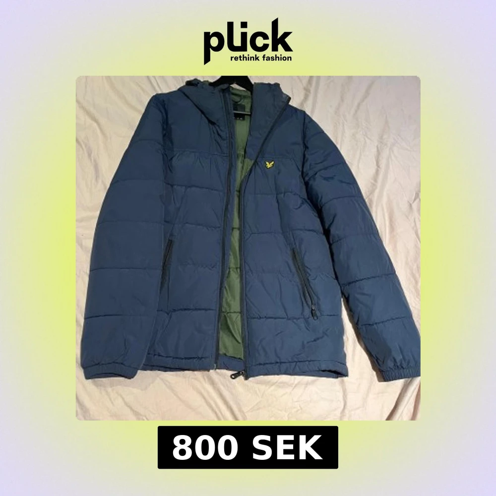 Snygg blå pufferjacka från Lyle & Scott med huva och dragkedja. Jackan har ett litet gult broderat emblem på bröstet och praktiska fickor med dragkedja. Perfekt för kyliga dagar.