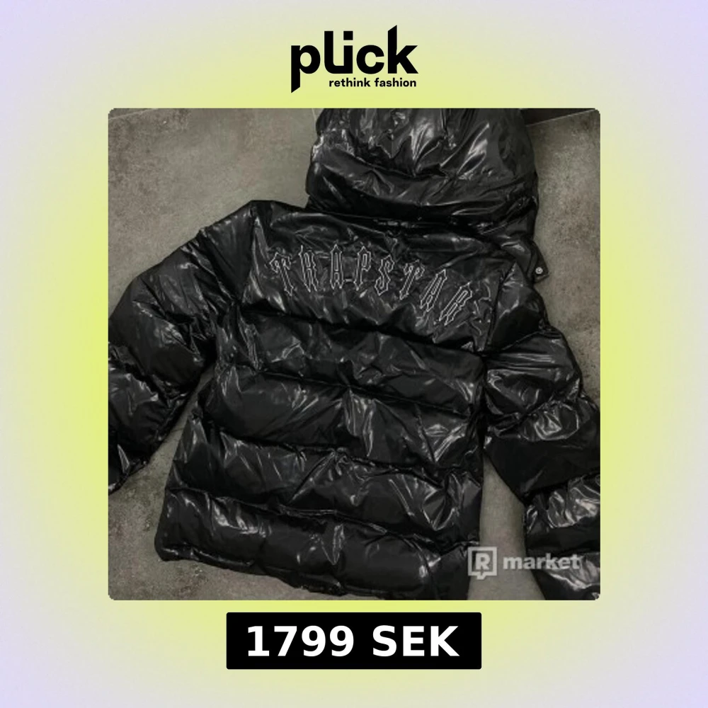Säljer en svart pufferjacka från Trapstar med glänsande yta och logotyp på ryggen. Jackan har långa ärmar och är tillverkad i 100% polyester. Perfekt för att hålla värmen med stil.