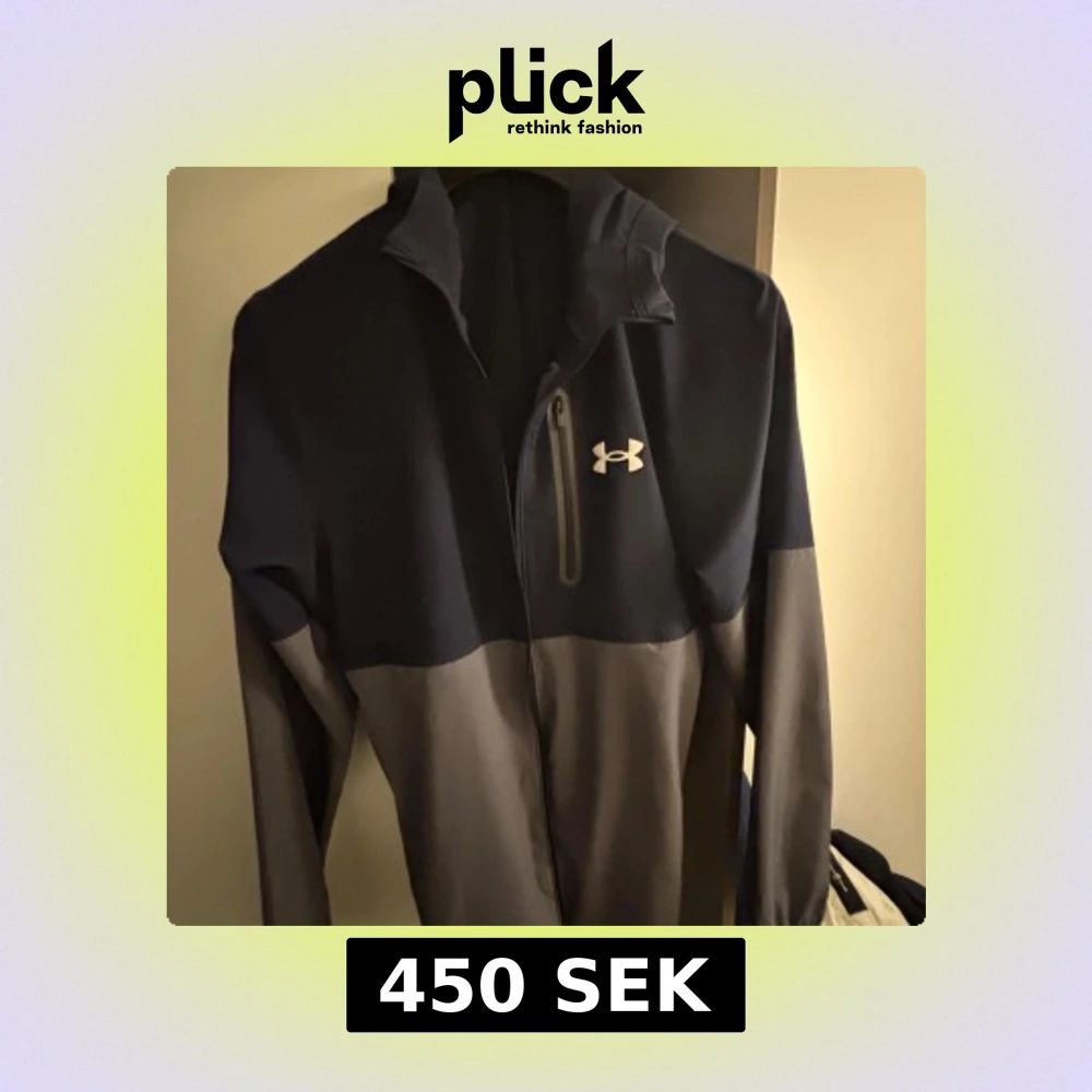 Snygg tvåfärgad vindjacka från Under Armour i mörkblått och grått. Jackan har hög krage, huva och en halv dragkedja framtill. Perfekt för dig som gillar sportig stil och vill ha något lätt och funktionellt.