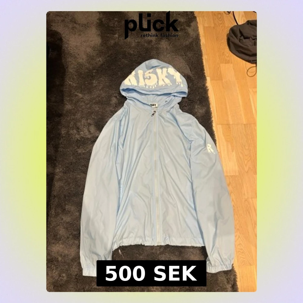 Snygg ljusblå vindjacka från Risky med coolt vitt tryck på huvan och ärmen. Jackan har dragkedja framtill, huva och elastiska muddar vid ärmslut och nederkant. Perfekt för dig som gillar streetwear och vill sticka ut med en unik look.
