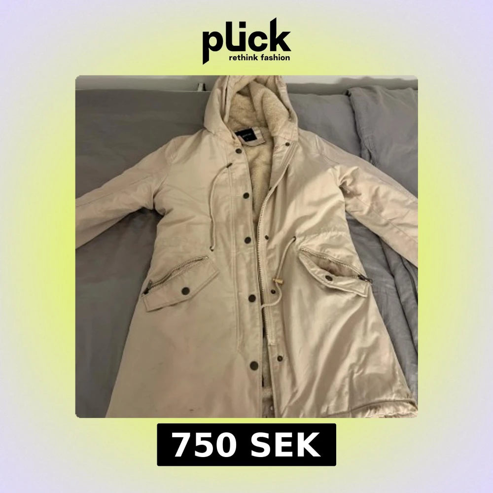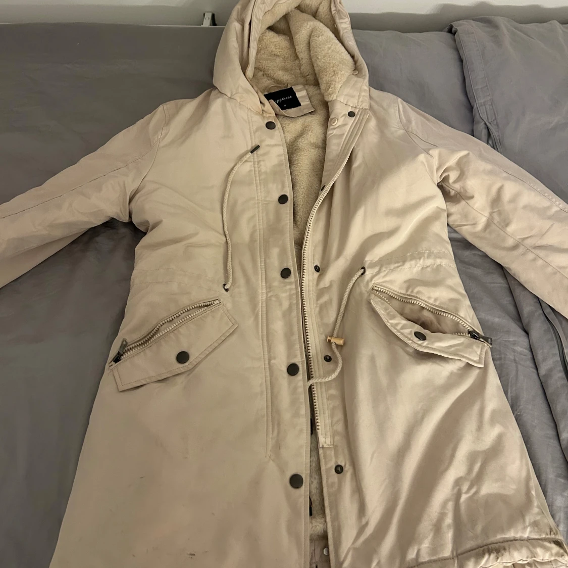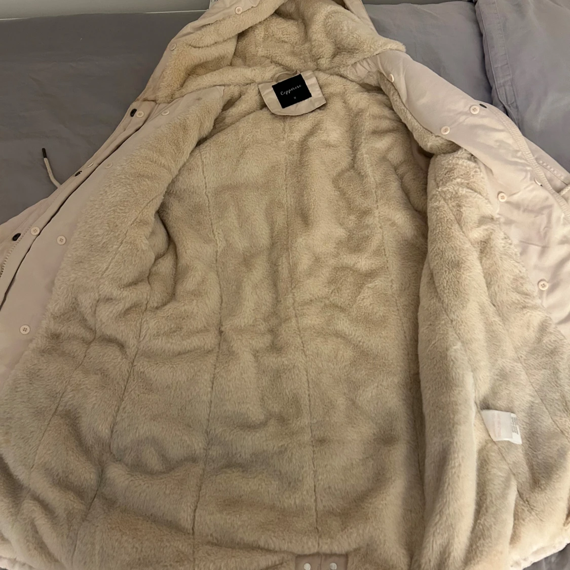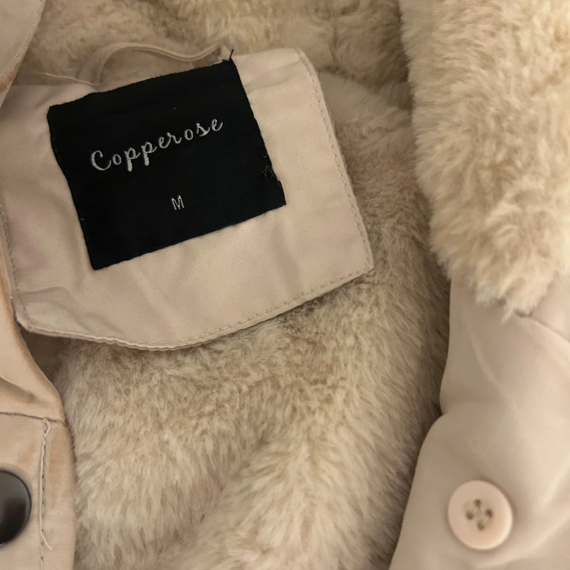 Snygg beige parkasjacka från Copperose med mjukt teddyfoder och huva. Jackan har dragkedja, knappar, snörning i midjan och stora fickor med dragkedja. Perfekt för kalla dagar när du vill vara både varm och stilren.