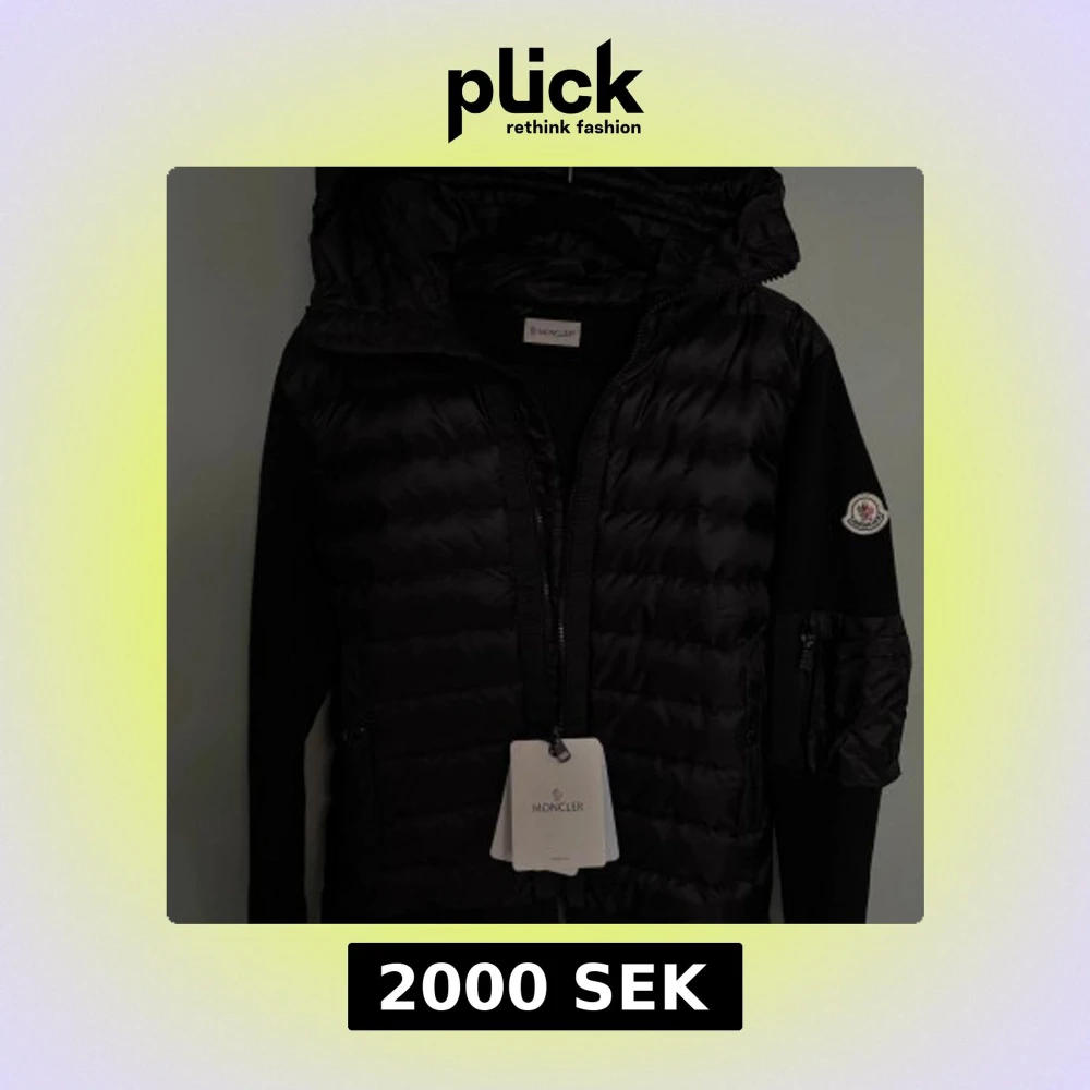 En svart monclear cardigan me monclear lapparna med väldigt varm så passar bra till höst och vinter den har också väldigt bra passform