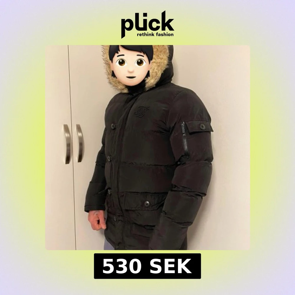 Svart pufferjacka från SikSilk med fluffig päls runt huvan och snygga detaljer som knappar och dragkedja på ärmen. Jackan har lång ärm, flera fickor och en stilren logga på bröstet. Perfekt för kalla dagar och riktigt skön att bära.