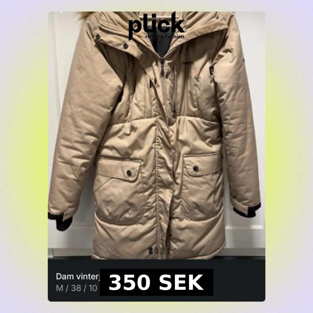 Säljer en beige vinterparkas från Trionarth med huva och fuskpäls. Jackan har flera fickor med både dragkedja och knappar, samt ribbade muddar vid ärmslut. Perfekt för kalla dagar och har en snygg, lång passform.