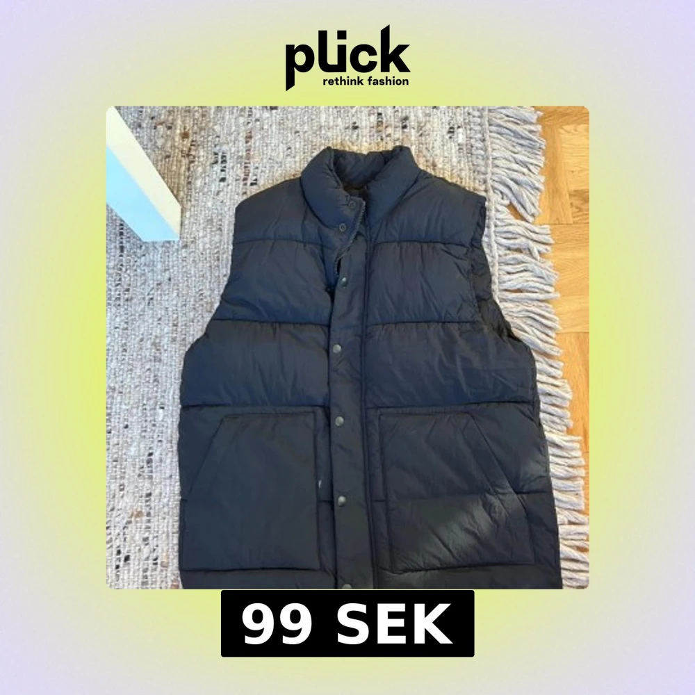 En svart dunväst med hög krage och stora, snedställda fickor framtill. Västen har tryckknappar och dragkedja, quiltad design och en clean look utan synliga loggor. Perfekt för lager-på-lager under kyliga dagar.