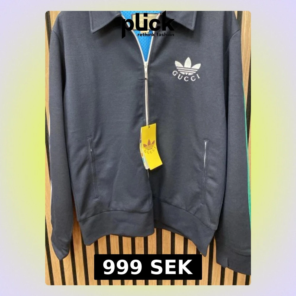 Snygg svart vindjacka med vit dragkedja, klassisk krage och logga på bröstet. Jackan har långa ärmar med gröna och röda ränder på sidan samt fickor med dragkedja. Perfekt för dig som gillar streetwear och exklusiva samarbeten.