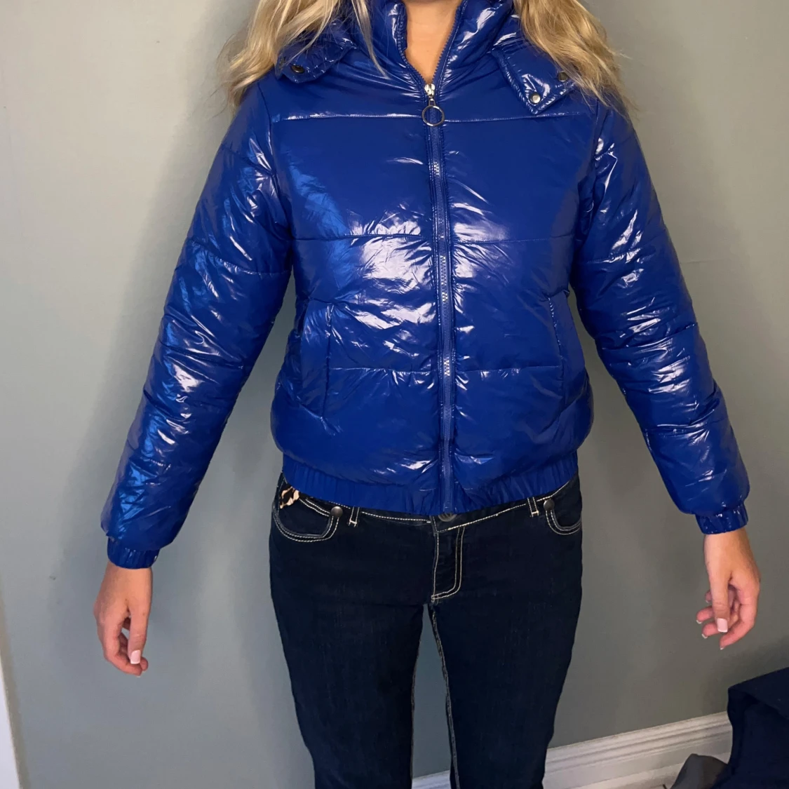 Snygg blå pufferjacka med glansigt material och dragkedja framtill. Jackan har en hög krage och långa ärmar, perfekt för kyligare dagar. Den har en modern och trendig look som passar bra till jeans. ( den är liten i storleken, snarare S!)