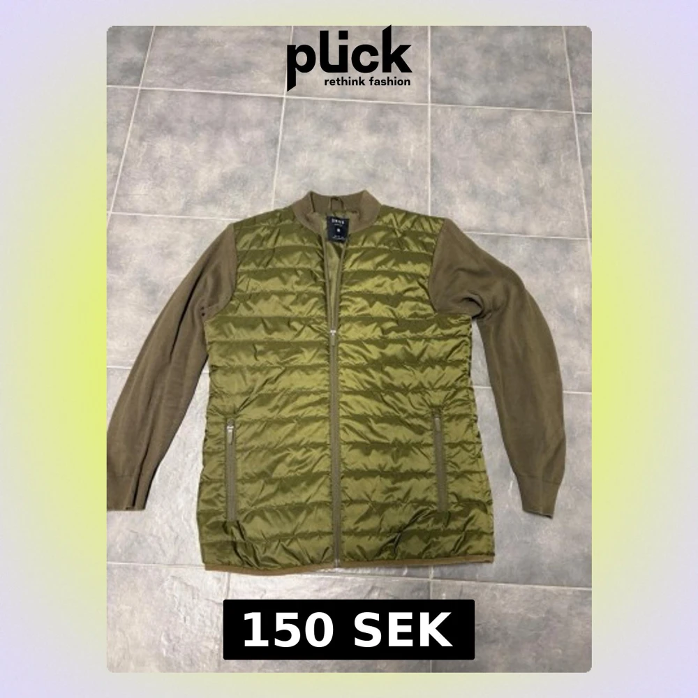 Säljer en olivgrön quiltad jacka från SMOG i slim fit. Jackan har stickade ärmar och krage, samt två fickor med dragkedja framtill. Kroppen är i glansig polyester med horisontella sömmar och ärmarna är mjukt stickade för extra komfort.