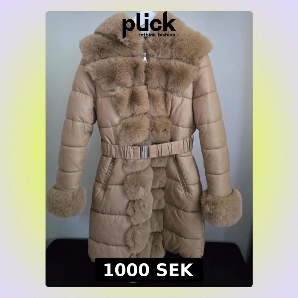 Säljer en beige pufferjacka med fluffiga fuskpälsdetaljer på krage, ärmslut och längs dragkedjan. Jackan har bälte i midjan, quiltad insida och dragkedja framtill. Perfekt för dig som vill ha en varm och snygg vinterjacka med extra lyxig känsla.