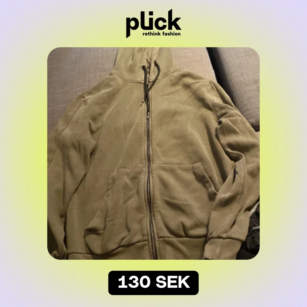 Säljer en olivgrön hoodie med dragkedja framtill. Den har en mysig huva och praktiska fickor. Perfekt för en avslappnad stil och passar bra till höst och vår.