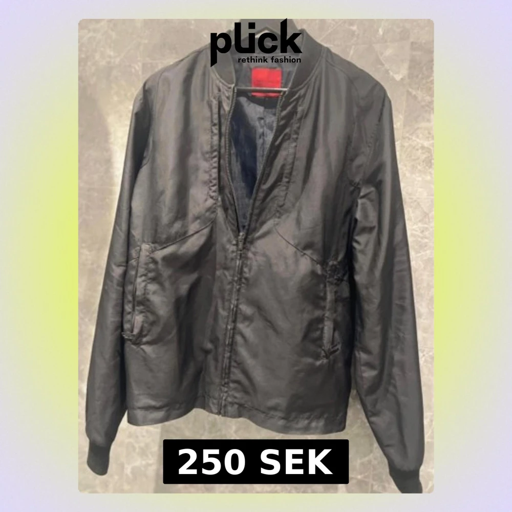 Säljer en svart bomberjacka i polyester med klassisk ribbad krage, muddar och nederkant. Jackan har dragkedja framtill och två snedställda fickor. Enkel och stilren design som passar till det mesta. Perfekt för dig som gillar en clean look.