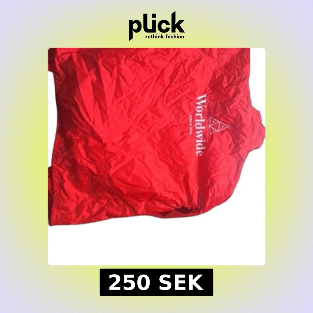 Riktigt snygg röd vindjacka från Worldwide med vitt tryck på bröstet och ryggen. Jackan har knappar framtill, dragsko nertill och långa ärmar med resår vid handlederna. Perfekt för dig som vill sticka ut med en färgstark look.