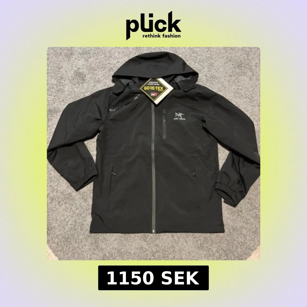 Svart vindjacka från Arc'teryx med Gore-Tex-material som är vattentätt och andas. Jackan har huva, hel dragkedja framtill och diskret logga på bröstet. Perfekt för blåsiga och regniga dagar, med minimalistisk design och praktiska fickor.