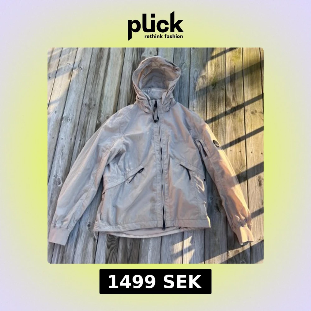 Snygg beige vindjacka från C.P. Company med huva och dragkedja. Jackan har långa ärmar och praktiska fickor med dragkedja. Perfekt för blåsiga dagar. Väldigt fin jacka med nypris på runt 5000 kr. Finns några fläckar som knappt syns. Försvinner i kemtvätt. Annars extremt bra skick